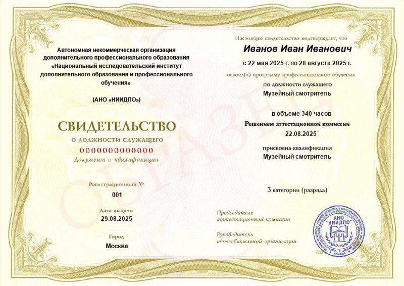 Обучающимся, завершившим обучение по основным программам профессионального обучения и успешно сдавшим квалификационный экзамен, выдается документ о квалификации – свидетельство о профессии рабочего или свидетельство о должности служащего, установленного образовательной организацией образца (в соответствии с Приказом Минпросвещения России от 26.08.2020 № 438).
