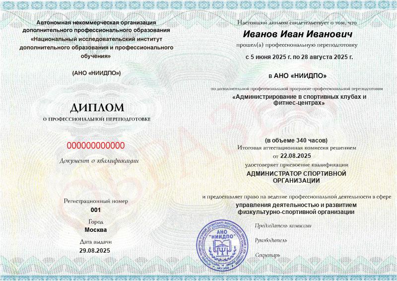 - Квалификация: Администратор спортивной организации