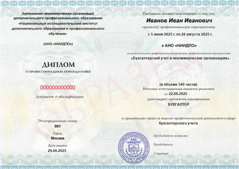 • Получите официальный диплом о профессиональной переподготовке бухгалтера НКО, который дает право работать по новой специальности.