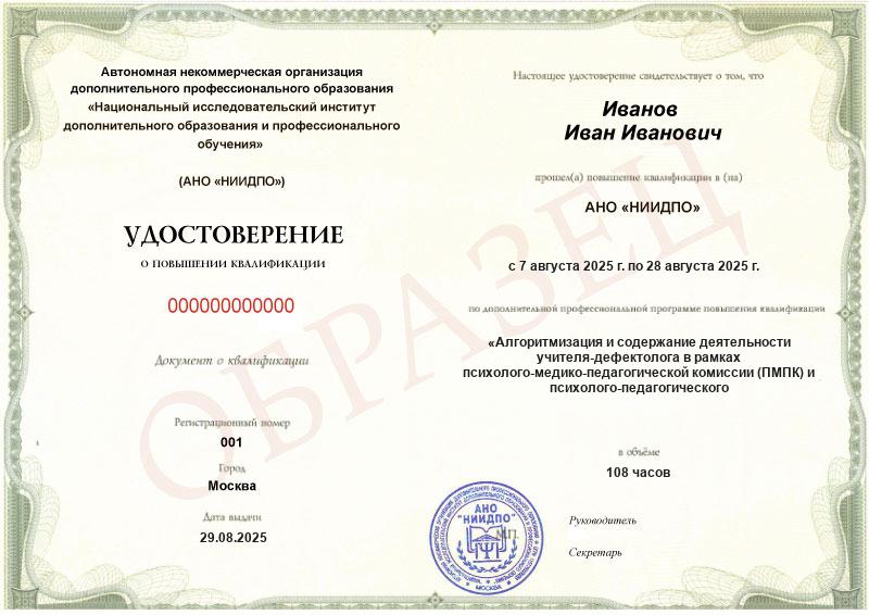 Алгоритмизация и содержание деятельности учителя-дефектолога в рамках психолого-медико-педагогической комиссии (ПМПК) и психолого-педагогического консилиума (ППк) (108ч)