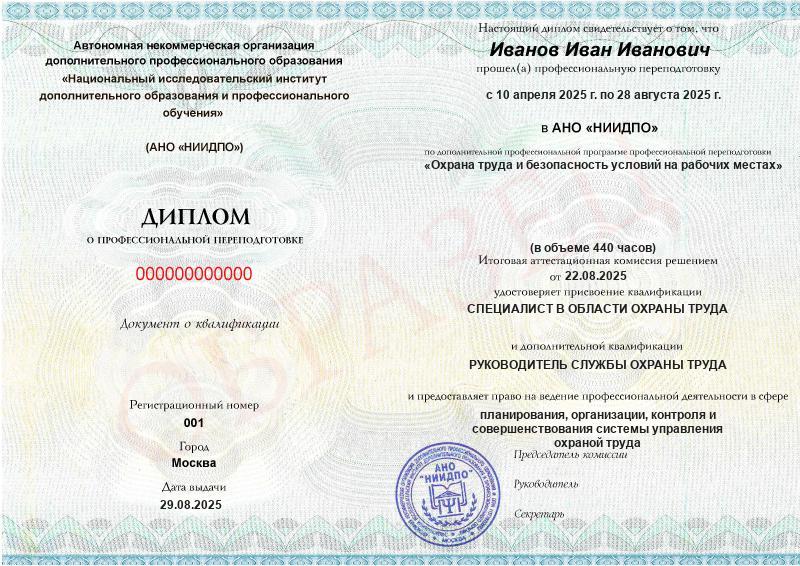 Да, документы оформляются на бланках с защитой от подделок, заполняются на русском языке, в них ставится печать АНО «НИИДПО».