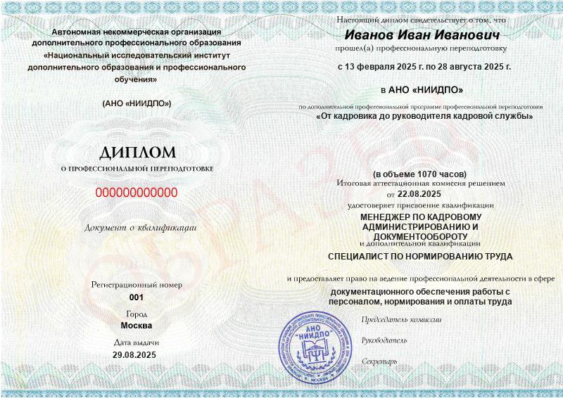• 2 квалификации: Менеджер по кадровому администрированию и документообороту + Специалист по нормированию труда