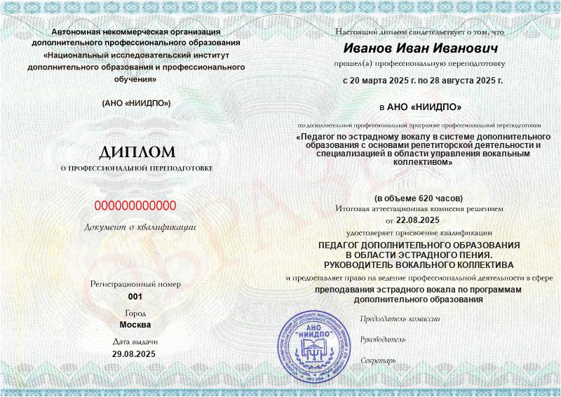 - 2 квалификации: Педагог дополнительного образования в области эстрадного пения. Руководитель вокального коллектива + Репетитор по вокалу