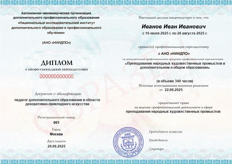 Да, документы оформляются на бланках с защитой от подделок, заполняются на русском языке, в них ставится печать АНО «НИИДПО».