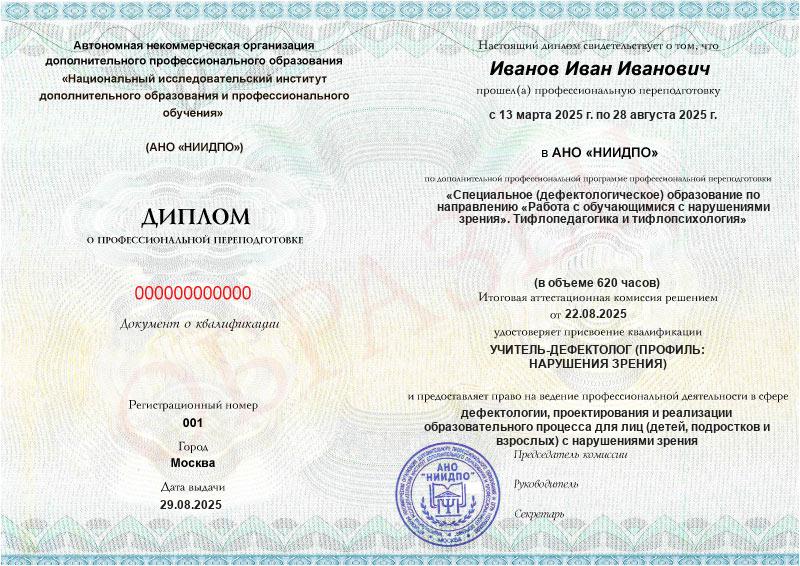 - Квалификация: Учитель-дефектолог (профиль: нарушения зрения)