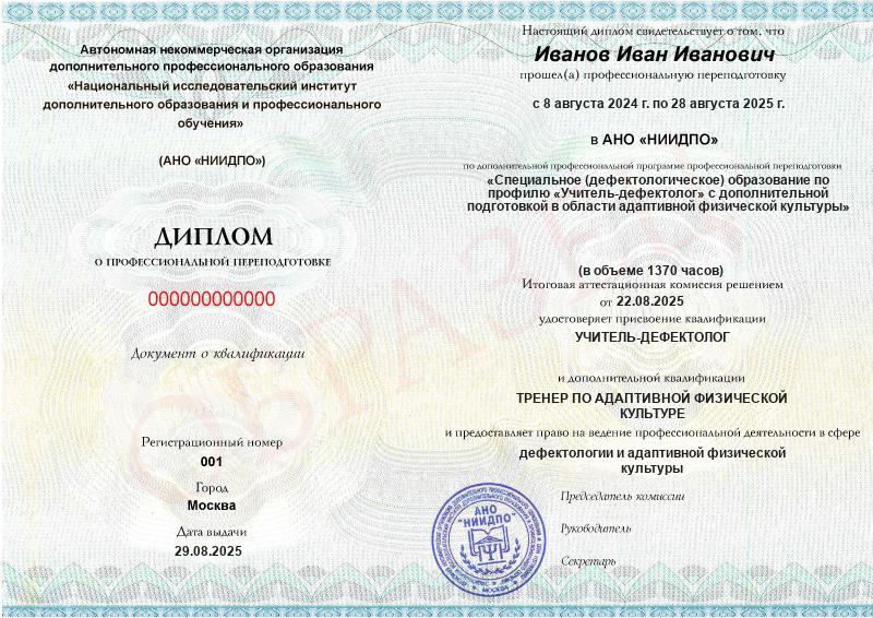 Специальное (дефектологическое) образование по профилю «Учитель-дефектолог» с дополнительной подготовкой в области адаптивной физической культуры (1370ч)