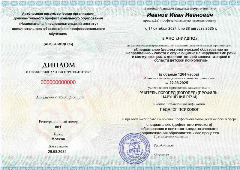 Специальное (дефектологическое) образование по направлению «Работа с обучающимися с нарушениями речи и коммуникации» с дополнительной специализацией в области детской психологии (1264ч)